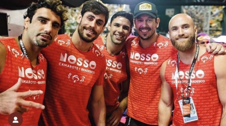 Leandro Lo, Cara de Sapato e o ator João Vicente junto a outros amigos na Sapucaí — Foto: Twitter