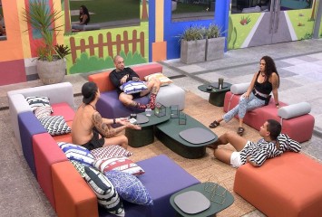 Bruna, Paula, Guimê e Gabriel continuam na área externa conversando sobre jogo. Eles falam sobre ...