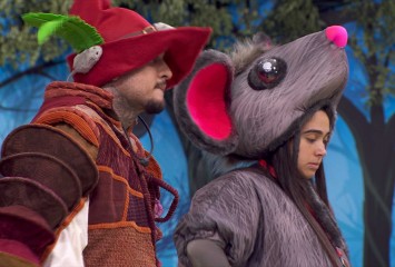 No Quarto Gnomo, Giovanna e MC Bin Laden vestem as roupas do Castigo do Monstro. Ao lado de Fernand...